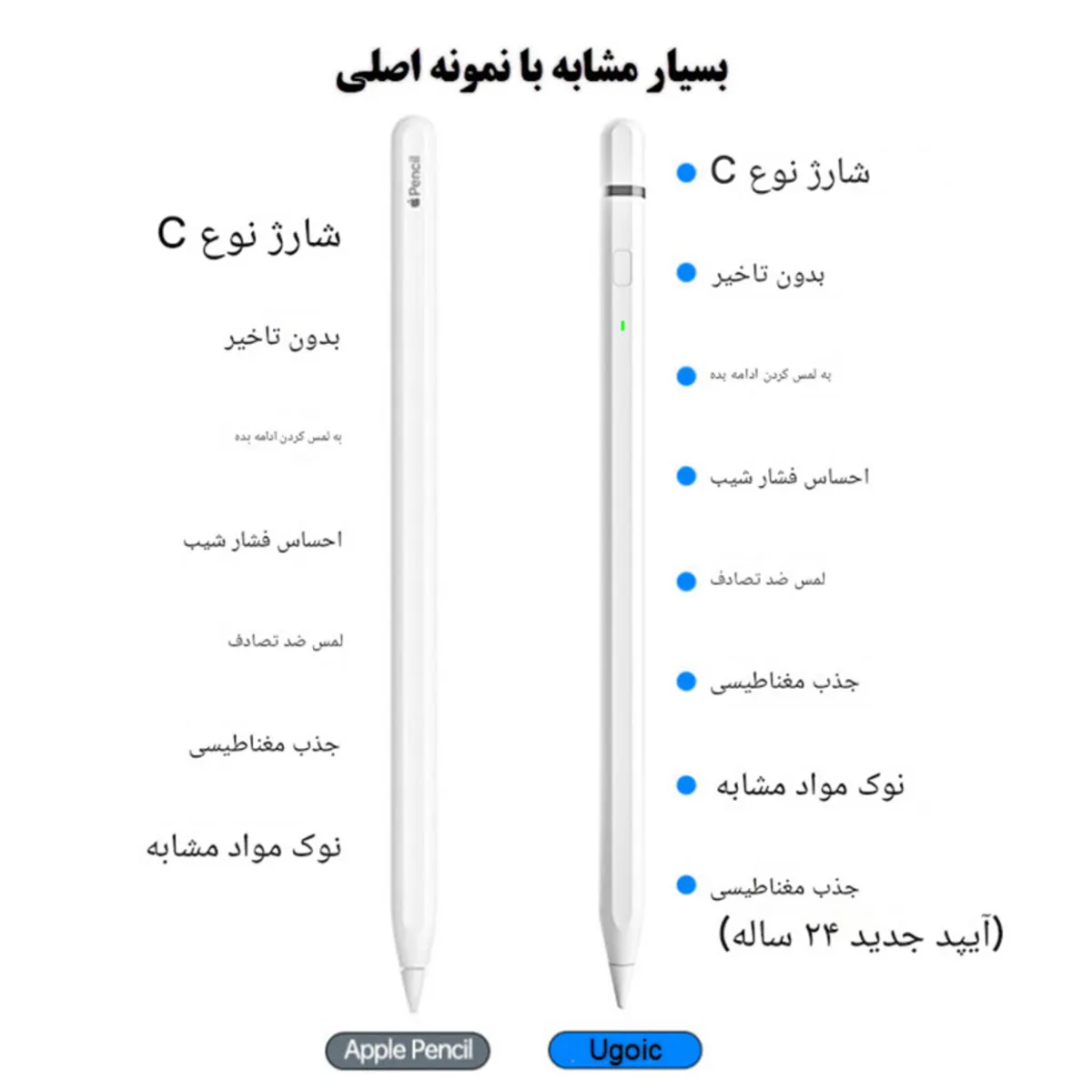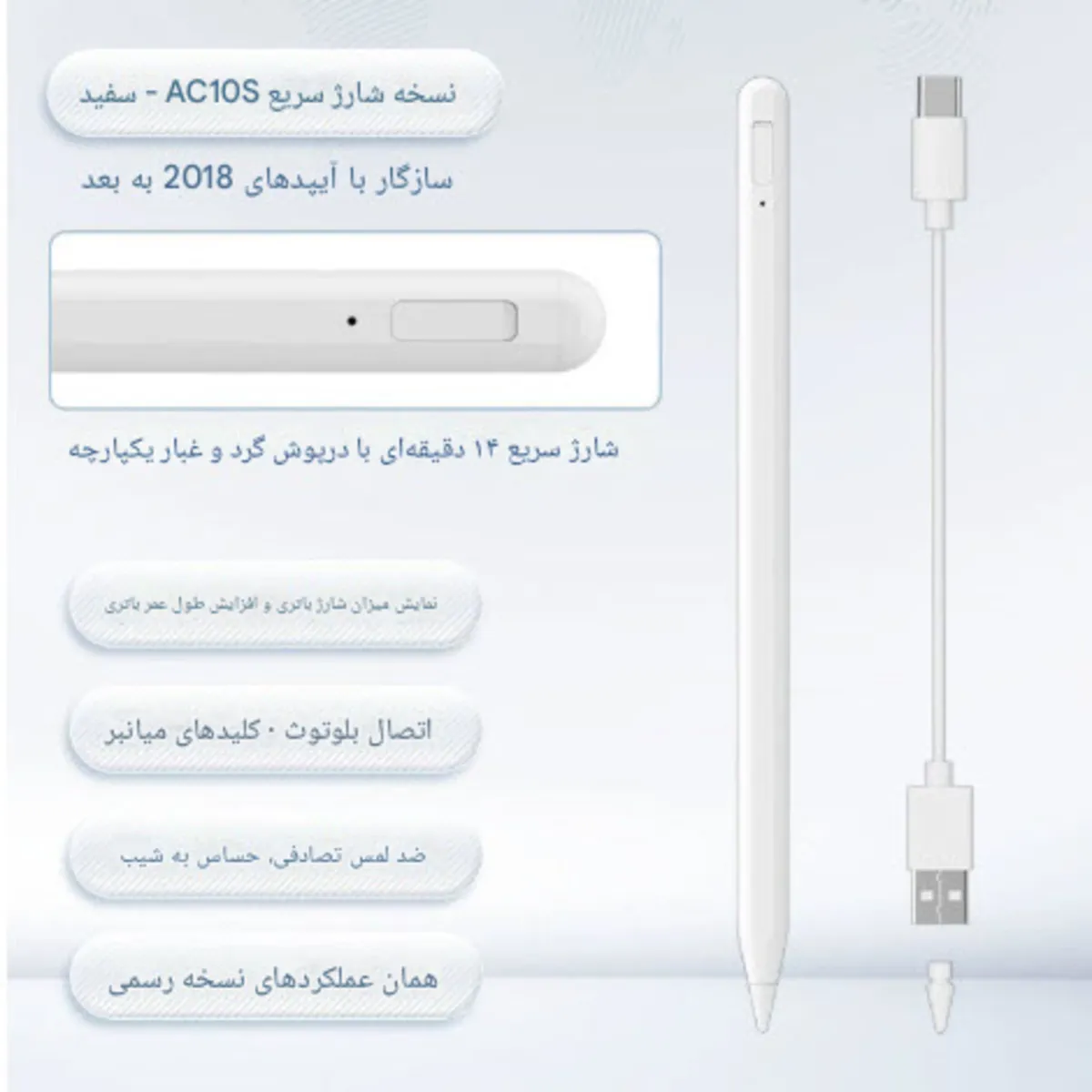 قلم لمسی یوجیک مدل UPencil 3 Plus (10S) از طریق بلوتوث به آیپد متصل میشود و پس از هماهنگ شدن، میزان باقیمانده باتری آن در ویجت باتری آیپد نمایش داده میشود. این قلم دارای ویژگیهای Palm Rejection برای جلوگیری از لمس ناخواسته دست، حساسیت به فشار تا 4096 سطح، و پشتیبانی از زاویه (Tilt) جهت تشخیص جهت قلم در طراحی است. همچنین دارای نوک قابل تعویض، اتصال مغناطیسی به بدنه آیپد برای نگهداری آسان، و درگاه شارژ USB Type-C با قابلیت شارژ سریع است. باتری داخلی آن حدود 130 میلیآمپرساعت ظرفیت دارد و برای استفاده مداوم تا حدود 10 ساعت دوام میآورد. این قلم با آیپدهای 2018 به بعد که از قلم فعال پشتیبانی میکنند، سازگار است.