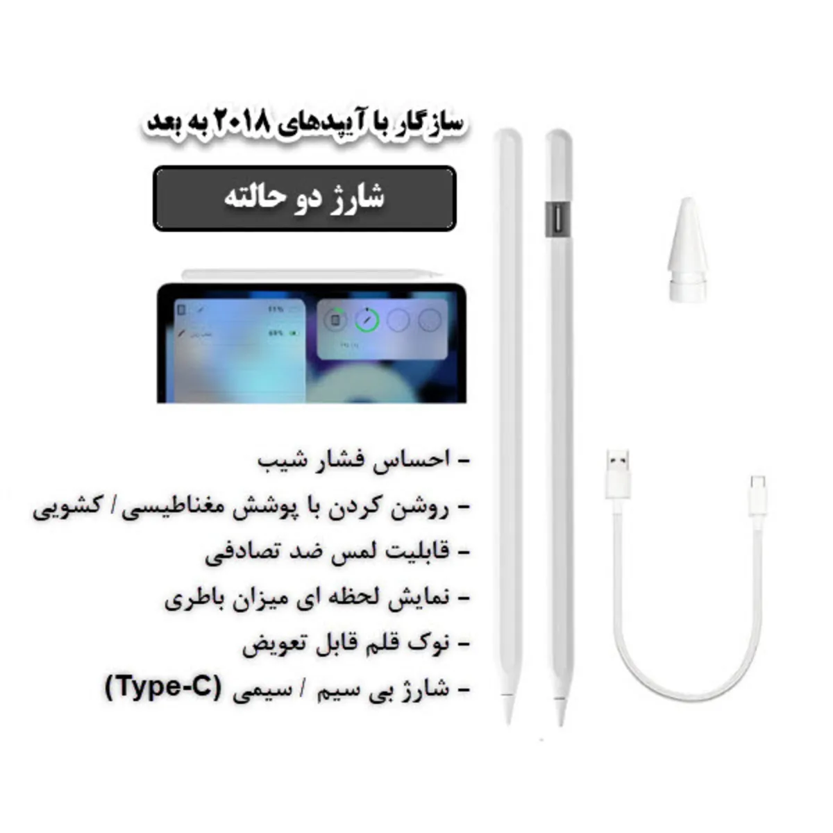 قلم لمسی یوجیک مدل (AC40) از طریق بلوتوث به آیپد متصل میشود و پس از هماهنگ شدن، میزان باقیمانده باتری آن در ویجت باتری آیپد نمایش داده میشود. این قلم دارای ویژگیهای Palm Rejection برای جلوگیری از لمس ناخواسته دست، حساسیت به فشار تا 4096 سطح، و پشتیبانی از زاویه (Tilt) جهت تشخیص جهت قلم در طراحی است. همچنین دارای نوک قابل تعویض، اتصال مغناطیسی به بدنه آیپد برای نگهداری آسان و شارژ مغناطیسی (توسط خود IPAD) همچنین درگاه شارژ USB Type-C با قابلیت شارژ سریع است. باتری داخلی آن حدود 130 میلیآمپرساعت ظرفیت دارد و برای استفاده مداوم تا حدود 10 ساعت دوام میآورد. این قلم با آیپدهای 2018 به بعد که از قلم فعال پشتیبانی میکنند، سازگار است.
