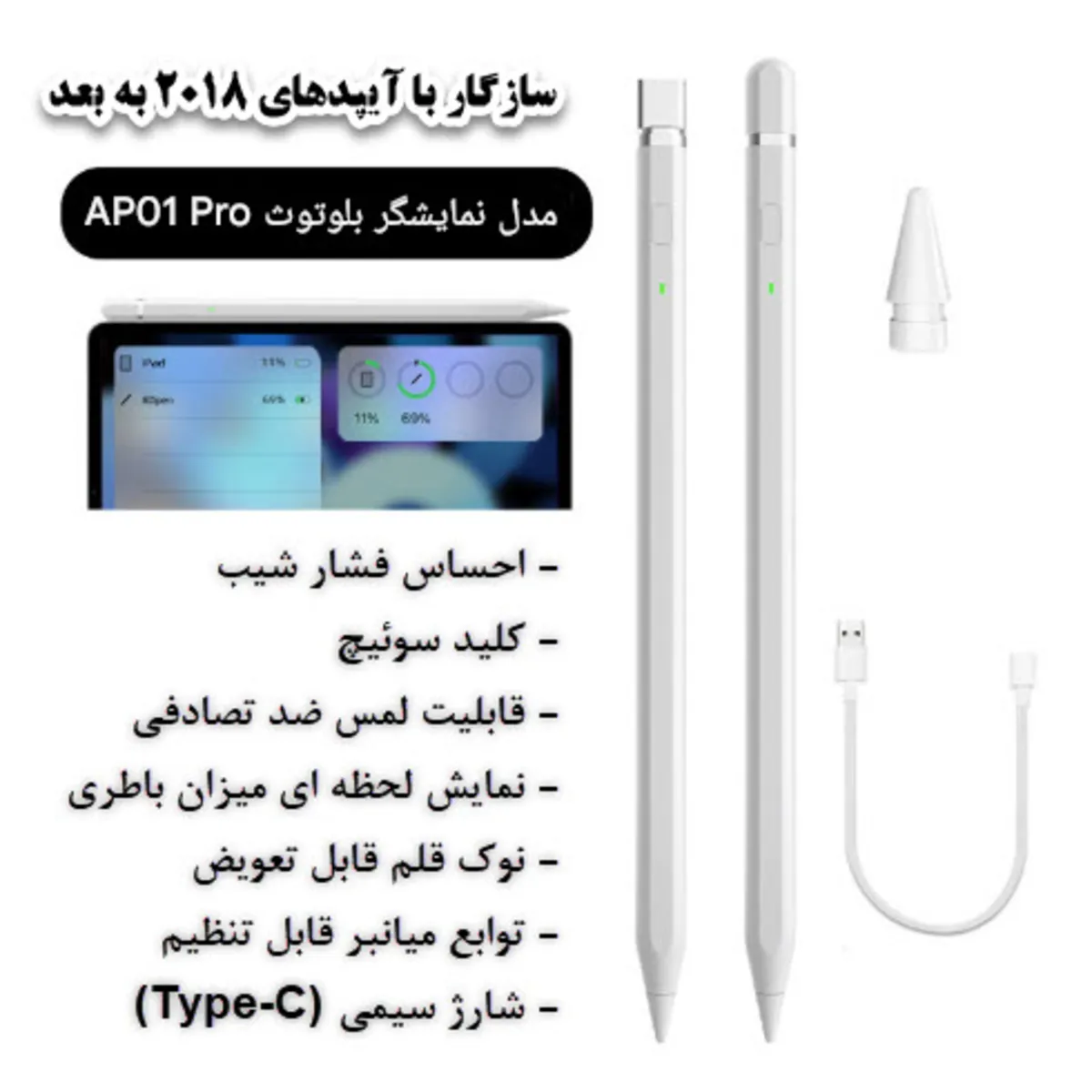 قلم لمسی یوجیک مدل AP01 pro از طریق بلوتوث به آیپد متصل میشود و پس از هماهنگ شدن، میزان باقیمانده باتری آن در ویجت باتری آیپد نمایش داده میشود. این قلم دارای ویژگیهای Palm Rejection برای جلوگیری از لمس ناخواسته دست، حساسیت به فشار تا 4096 سطح، و پشتیبانی از زاویه (Tilt) جهت تشخیص جهت قلم در طراحی است. همچنین دارای نوک قابل تعویض، اتصال مغناطیسی به بدنه آیپد برای نگهداری آسان، و درگاه شارژ USB Type-C با قابلیت شارژ سریع است. باتری داخلی آن حدود 130 میلیآمپرساعت ظرفیت دارد و برای استفاده مداوم تا حدود 50 ساعت دوام میآورد. این قلم با آیپدهای 2018 به بعد که از قلم فعال پشتیبانی میکنند، سازگار است.