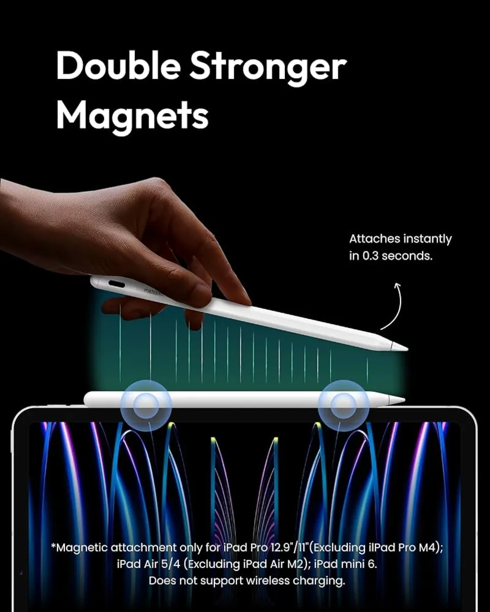 قلم لمسی متاپن از طریق بلوتوث به آیپد متصل میشود و پس از هماهنگ شدن، میزان باقیمانده باتری آن در ویجت باتری آیپد نمایش داده میشود. این قلم دارای ویژگیهای Palm Rejection برای جلوگیری از لمس ناخواسته دست، حساسیت به فشار تا 4096 سطح، و پشتیبانی از زاویه (Tilt) جهت تشخیص جهت قلم در طراحی است. همچنین دارای نوک قابل تعویض، اتصال مغناطیسی به بدنه آیپد برای نگهداری آسان، و درگاه شارژ USB Type-C با قابلیت شارژ سریع است. باتری داخلی آن حدود 130 میلیآمپرساعت ظرفیت دارد و برای استفاده مداوم تا حدود 10 ساعت دوام میآورد. این قلم با آیپدهای 2018 به بعد که از قلم فعال پشتیبانی میکنند، سازگار است